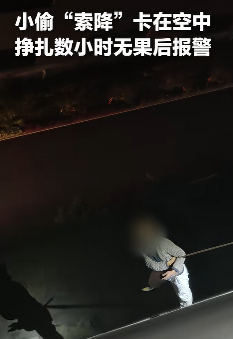 4月11日凌晨,安徽南陵一男子钱某全为盗窃,从公司楼顶索降却操作失误,被绳索缠绕困在七楼外墙。挣扎数小时后,他无奈报警求救,@南陵警方 和顺路派出所民警协同消防将其安全解救。目前,违法男子钱某全因盗窃被警方依法行政处罚。