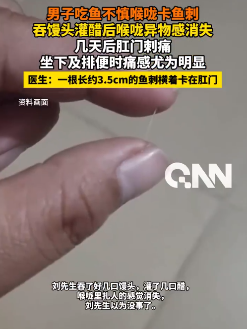 近日,郑州人民医院公开一次病例,45岁的刘先生晚饭时,不慎将一根鱼刺卡在喉咙。刘先生吞了好几口馒头,灌了几口醋,喉咙里扎人的感觉消失,刘先生以为没事了。但接下来几天,他总觉得腹部隐隐不舒服,起初以为是消化不良,没有在意。到了第4天,他感受到了尖锐的刺痛,坐下或排便时痛感尤其明显。刘先生去医院就诊,检查证实,一根长约3.5cm的鱼刺横着卡在刘先生肛管粘膜内,两端已刺入组织,一端紧邻血管,最终医生通过手术将其取出。