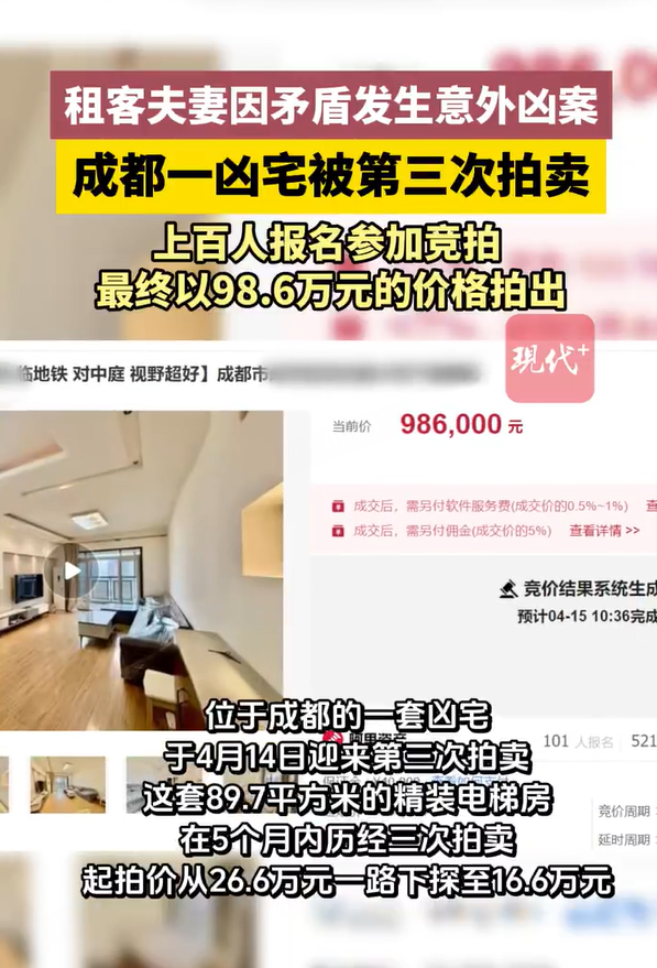 4月14日,成都凶宅于迎来第三次拍卖,这套89.7平方米的精装电梯房,在5个月内历经三次拍卖,起拍价从26.6万元一路下探至16.6万元。4月15日上午拍卖结束,这次总计有上百人报名参与竞拍,最终以98.6万元的价格拍出。 2025年11月5日,该商品房被首次拍卖。拍卖页面显示,该标的物存在非正常死亡事故,请谨慎购买。该次起拍价为26.6万元,依旧吸引了92人参与竞拍,最终以105.6万元的价格拍出。首次拍卖结束两个月后,2026年1月6日,该套商品房被买家急速转手,再次上架拍卖平台,并标注为“凶宅二次转卖”。起拍价同样为26.6万元,最终以96.6万元的价格落槌。 4月14日上午,这套房屋迎来第三次拍卖,起拍价为16.6万元,比前两次降低了10万元。现代快报记者留意到,这次拍卖页面以醒目字眼提醒,2024年5月,该房屋内有租客两口子因为矛盾发生意外凶案。 4月15日上午拍卖结束,最终以98.6万元的价格被拍出。这次拍卖共吸引101人参加,拍卖总共经历40轮出价。 为何这套房子会被再次拍卖?负责该起拍卖的四川某拍卖公司一名工作人员告诉现代快报记者:“第一次成功竞拍的人,是因为不在成都生活,家里又着急用钱,所以把房子拿出来拍卖了。”该工作人员表示,第二次中拍的竞拍人,是想贷款购买房子,但没有贷款成功,所以没能支付房款,并不存在其他隐情。