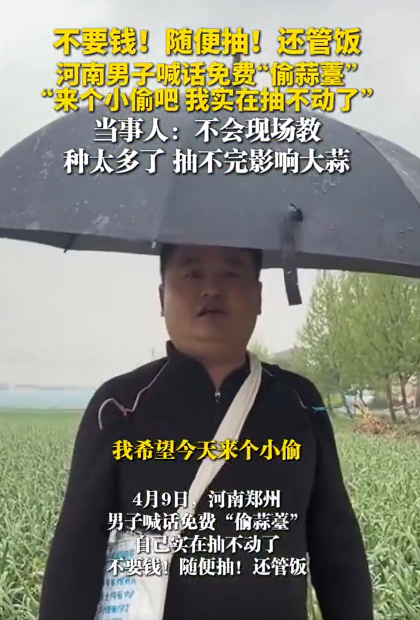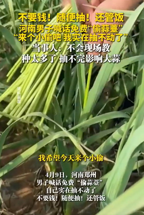 4月9日,河南郑州。河南男子喊话免费“偷蒜薹”,自己实在抽不动了。据悉,郑先生有四五亩地的蒜苔需要被“偷走”,都是自家种的。自己太累不想抽,但不抽出来会影响下面大蒜的生长。他说,要来的话,什么都不用带,直接用手拽就行,只要不把下面大蒜拽坏,想抽多少就抽多少。不会抽的可以现场教学。据了解,抽蒜薹可以让大蒜更好的生长,但需弯腰作业,重复动作多,属于高强度体力劳动。
