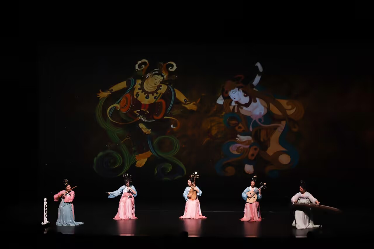本场演出以寻找“二十四伎乐”为线索,通过民族器乐独奏、重奏、合奏等形式,将整场划分为“华夏正声”“敦煌乐韵”“唐宫乐舞”“锦城丝管”四个篇章。曲目编排上,从《德音》到《烈焰》,串联起不同时期的音乐风格。演出在音乐演奏基础上,结合了舞台美术设计,并融入了诗词、书画、舞蹈等元素。